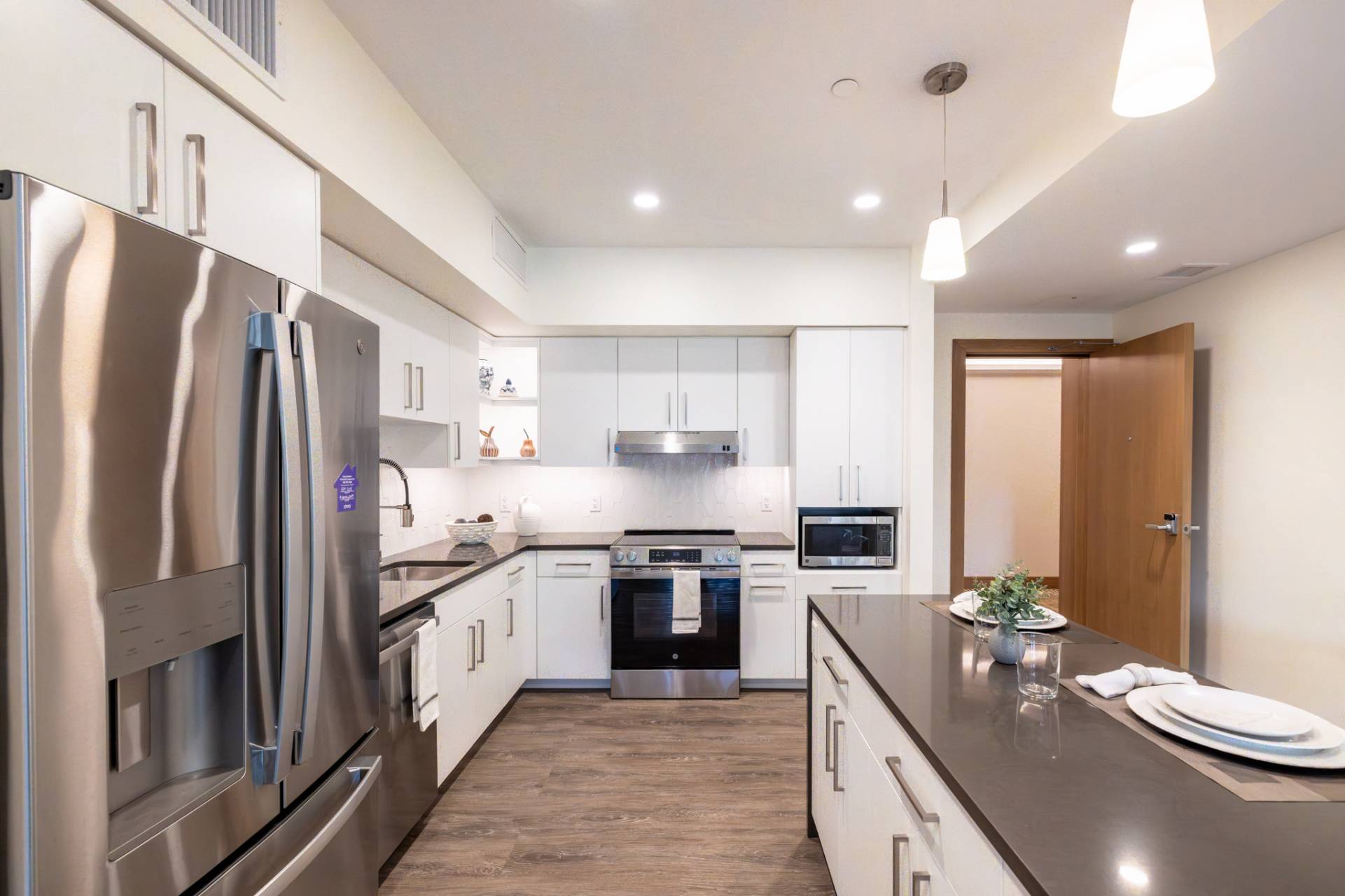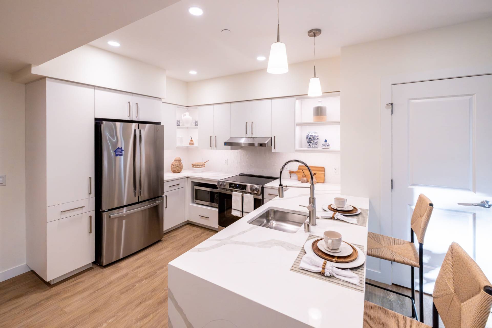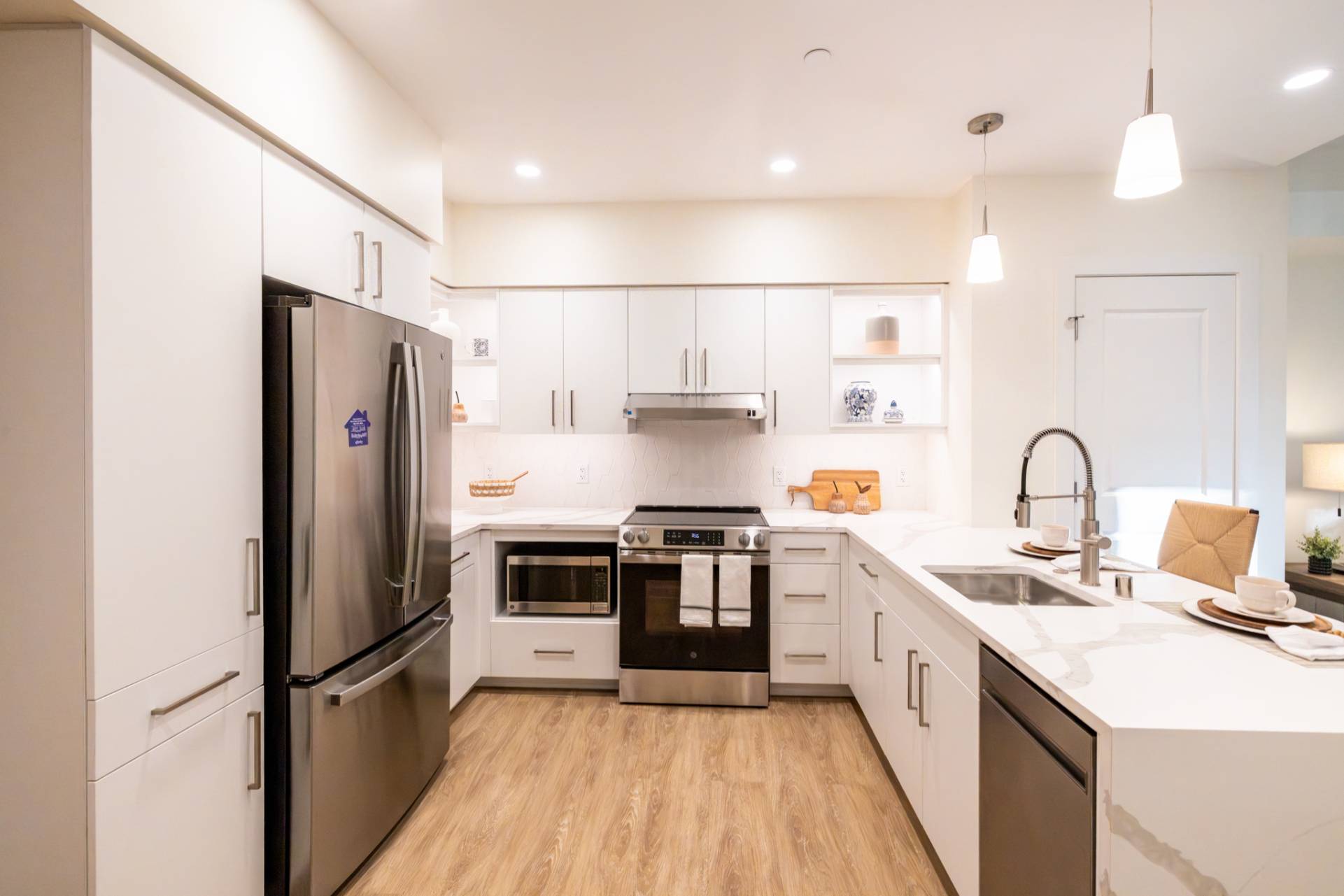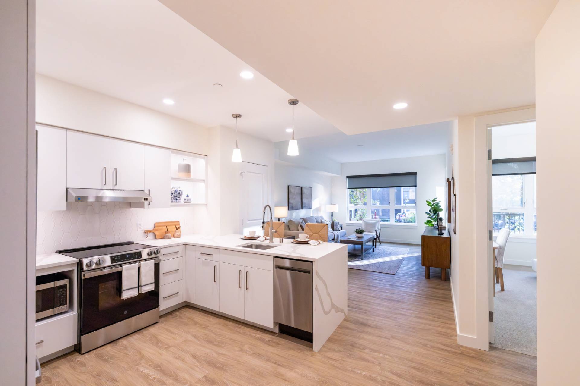 Here you'll find only the finest finishes, with luxury carpet in the bedrooms, quartz countertops in the kitchen, and Corian® countertops in the bath, stainless steel appliances, luxury vinyl plank flooring throughout the kitchen and living areas, and premier cabinetry with under-cabinet lighting in the kitchen.