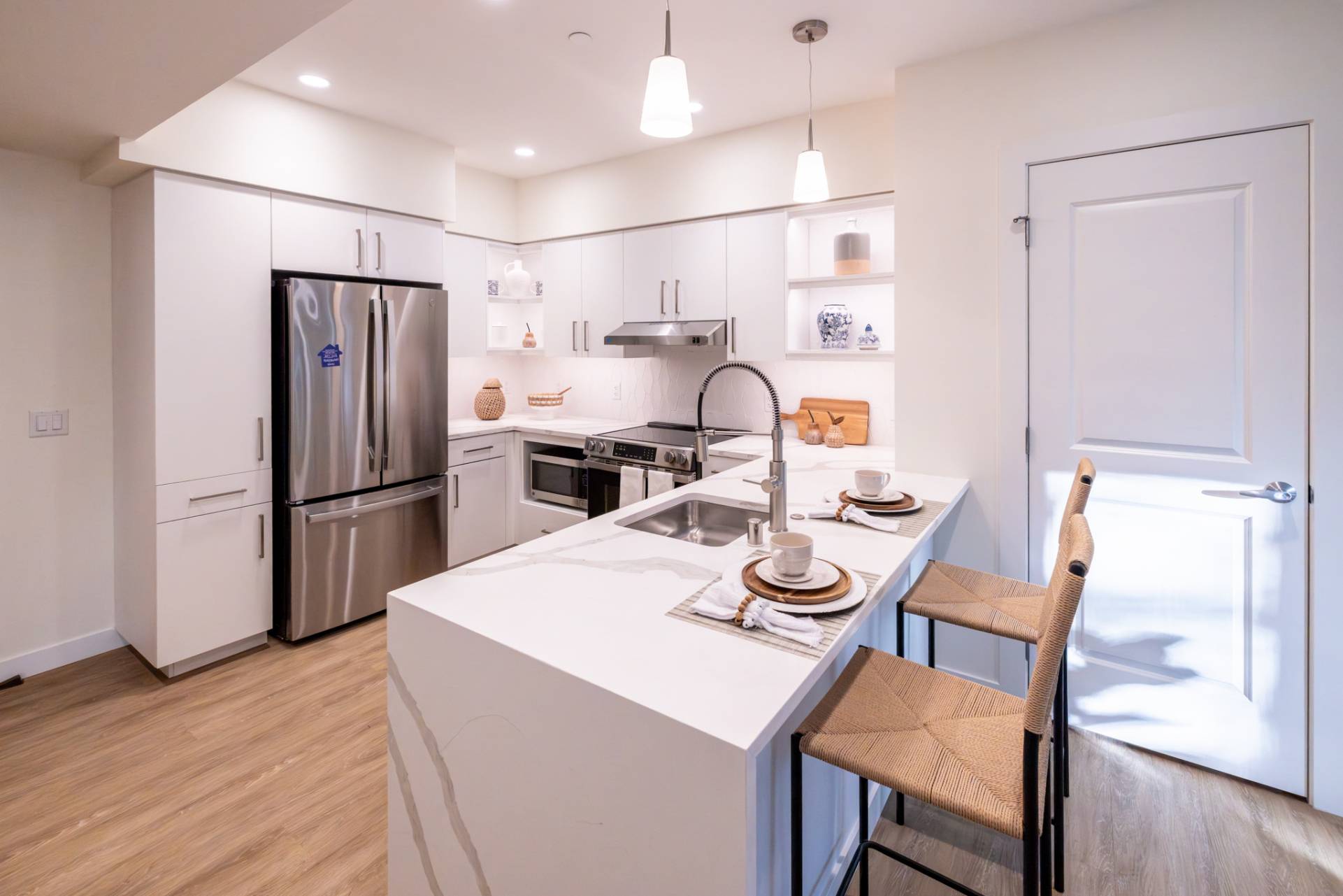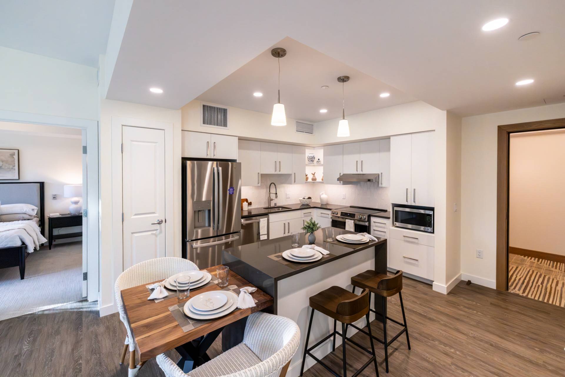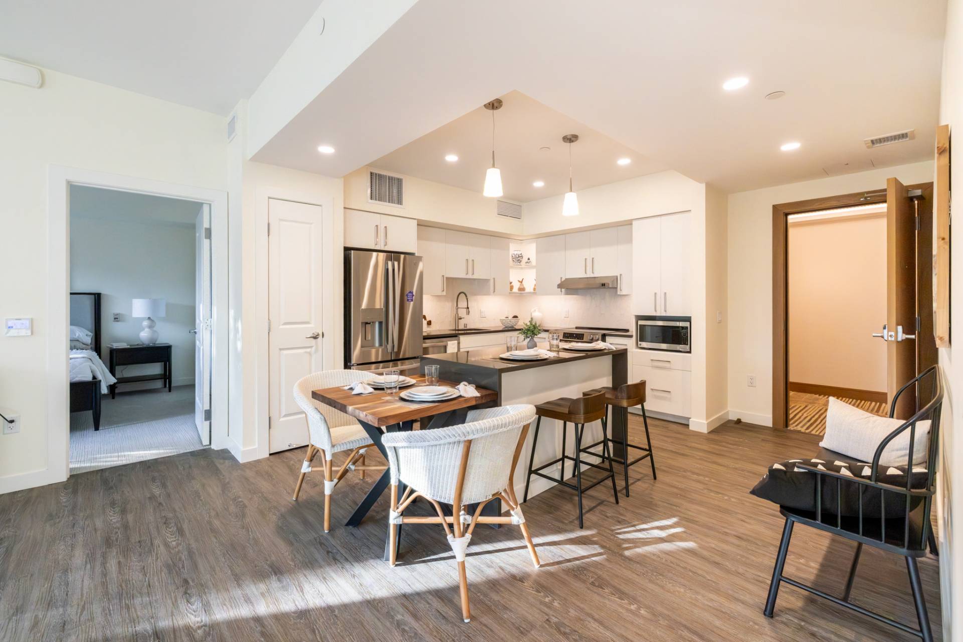 Here you'll find only the finest finishes, with luxury carpet in the bedrooms, quartz countertops in the kitchen, and Corian® countertops in the bath, stainless steel appliances, luxury vinyl plank flooring throughout the kitchen and living areas, and premier cabinetry with under-cabinet lighting in the kitchen.